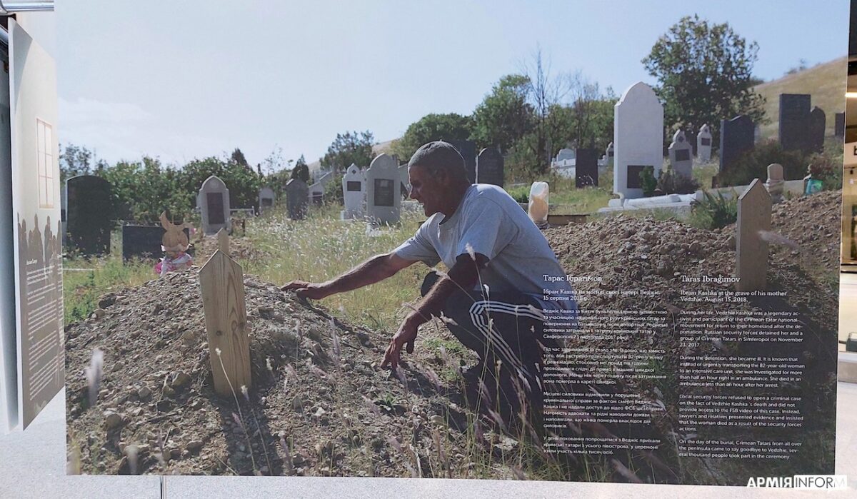Зі сльозами на очах люди також дивляться й на одну зі світлин Тараса Ібрагімова, де сфотографовано чоловіка на цвинтарі. Це Ібрам Кашка на могилі своєї матері Веджіс влітку 2018 року. Веджіс Кашка за життя була активісткою та учасницею національного руху кримських татар за повернення на батьківщину після депортації. У листопаді 2017-го російські силовики затримали її та групу кримських татар у Сімферополі. Під час затримання їй стало зле. Відомо, що замість того, аби транспортувати 82-річну жінку до лікарні, стосовно неї понад пів години проводилися слідчі дії прямо в машині швидкої допомоги. Менш ніж за годину після затримання вона померла в кареті швидкої…