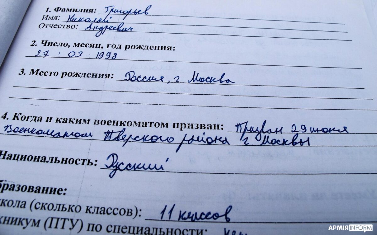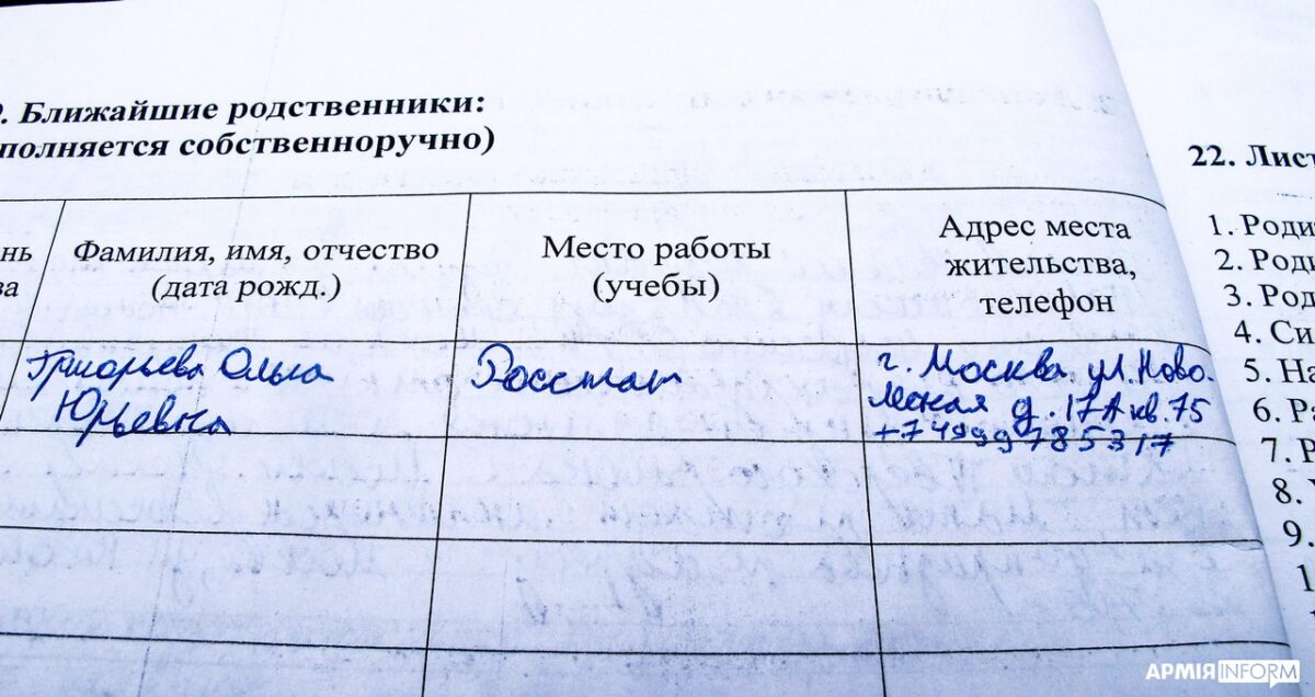 Отже, якщо вірити власноруч заповненій справі, Микола Андрійович Грігорьєв корінний москвич, який народився 27 березня 1998 року. У москві він проживав за адресою вулиця новолісна, будинок 17\А, квартира 75. До речі, за цією ж адресою проживає і дружина цього загарбника, Наталія Тенгізовна Грігорьєва та його мати Ольга Юріївна. До того ж матері можна навіть зателефонувати, адже в особовій справі вказано її номер телефону +74999785317.
