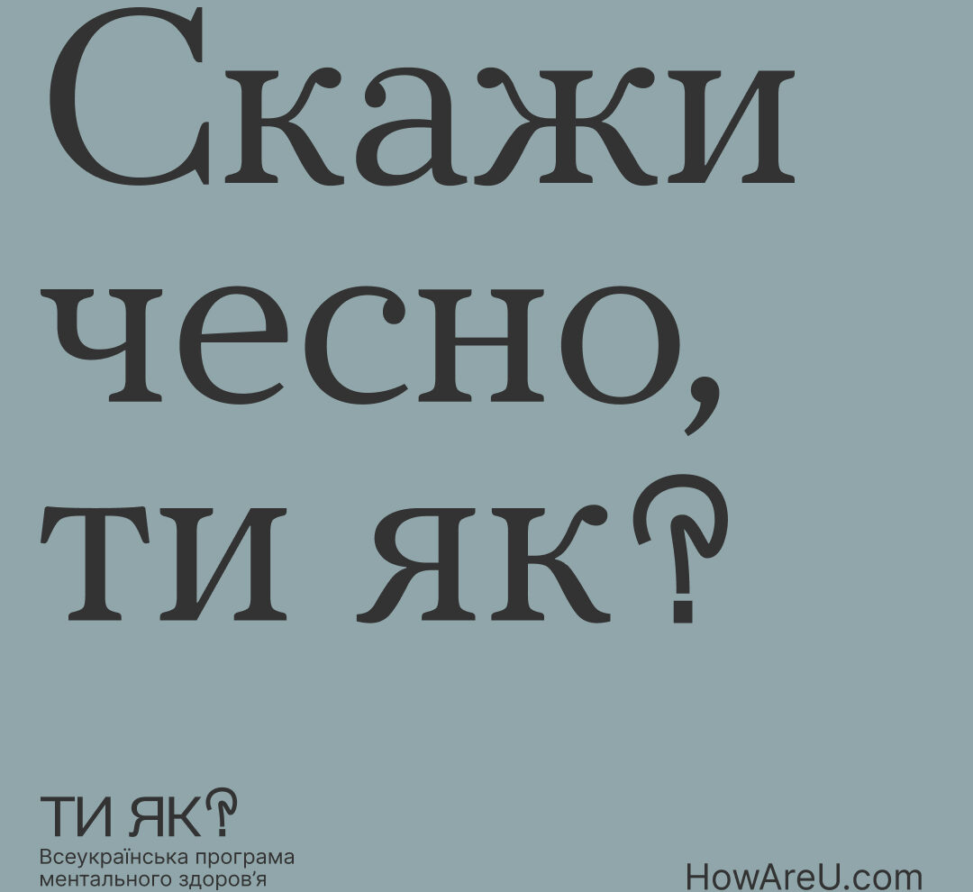 Довідка. Всеукраїнська програма ментального здоров’я «Ти як?», ініційована Оленою Зеленською. Розробку та впровадження Всеукраїнської програми ментального здоров’я координує МОЗ України. Всесвітня організація охорони здоров’я (World Health Organization Ukraine) — експертний партнер, виконавчий партнер — громадська організація «Безбар’єрність». Майданчиком для розробки та ухвалення рішень є Міжвідомча координаційна рада при Кабінеті Міністрів України. Комунікаційна кампанія реалізується за підтримки Агентства США з міжнародного розвитку (USAID Ukraine — USAID Україна)