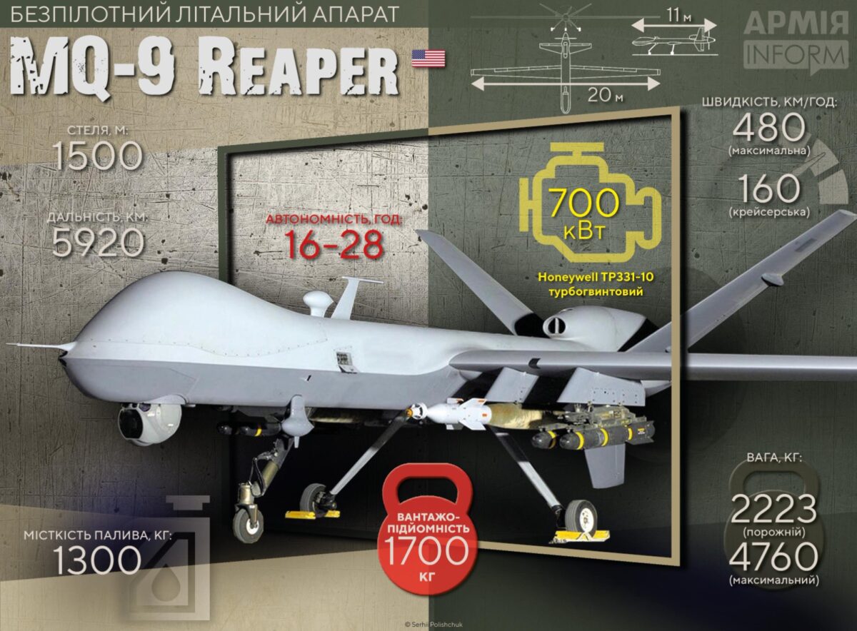 Треба, звичайно, зазначити, що в порівнянні зі своїм «батьком» — Predator, Reaper має майже вшестеро більшу вантажопідйомність, яка дозволяє йому використовувати набагато ширший діапазон зброї, що виходить далеко за межі ракет Hellfire. Машина завдовжки 11 метрів, за розмаху крила — 20 метрів. Максимальна швидкість досягає близько 480 км/год, майже вдвічі швидше за Bayraktar TB2, а тривалість польоту оцінюється у 28 годин. Дальність польоту дрону залежно від модифікації становить 1900–2575 км. Практична стеля —13 000 м. Залежно від бойового завдання БПЛА може мати різноманітні комбінації озброєнь та електронного обладнання. Станом на 2023 рік було виготовлено понад 270 екземплярів MQ-9 Reaper. Вартість безпілотника — від $16 млн до $30 млн.