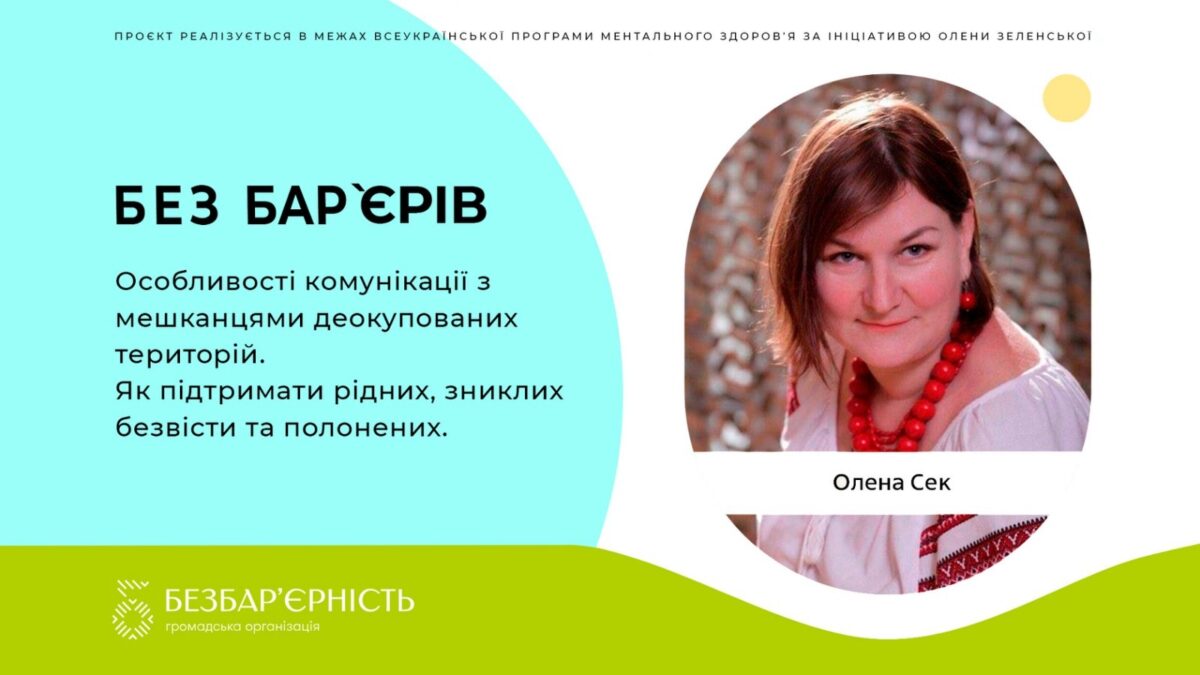 Просто зараз тисячі українців не знаходять собі місця, бо близька людина зникла безвісти або в полоні у ворога. Інші не можуть заснути, бо їм сняться жахи окупації. Неможливо уявити, що відбувається у свідомості, коли ворог контролює не лише твою територію, а й тебе безпосередньо, родини, дітей. У психології навіть є спеціальний термін — ізоляційна компресія. Завдання психолога — декомпресувати їх, стабілізувати їхню психіку та емоційно відновити. Як це зробити, розповіла у прямому ефірі громадської організації «Безбар’єрність» військова психологиня, тренерка з виживання та опору у ворожому середовищі, учасниця проєкту «Психосоціальна підтримка під час війни» Олена Сек.