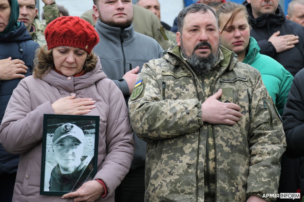 Боєць з позивним «Грифон» стоїть тут сьогодні поряд зі своєю жінкою. Вони оплакують свого старшого сина. А рік тому на цьому місці «Грифон» та його син пліч-о-пліч відбивали росіян. Віталій був гранатометником.