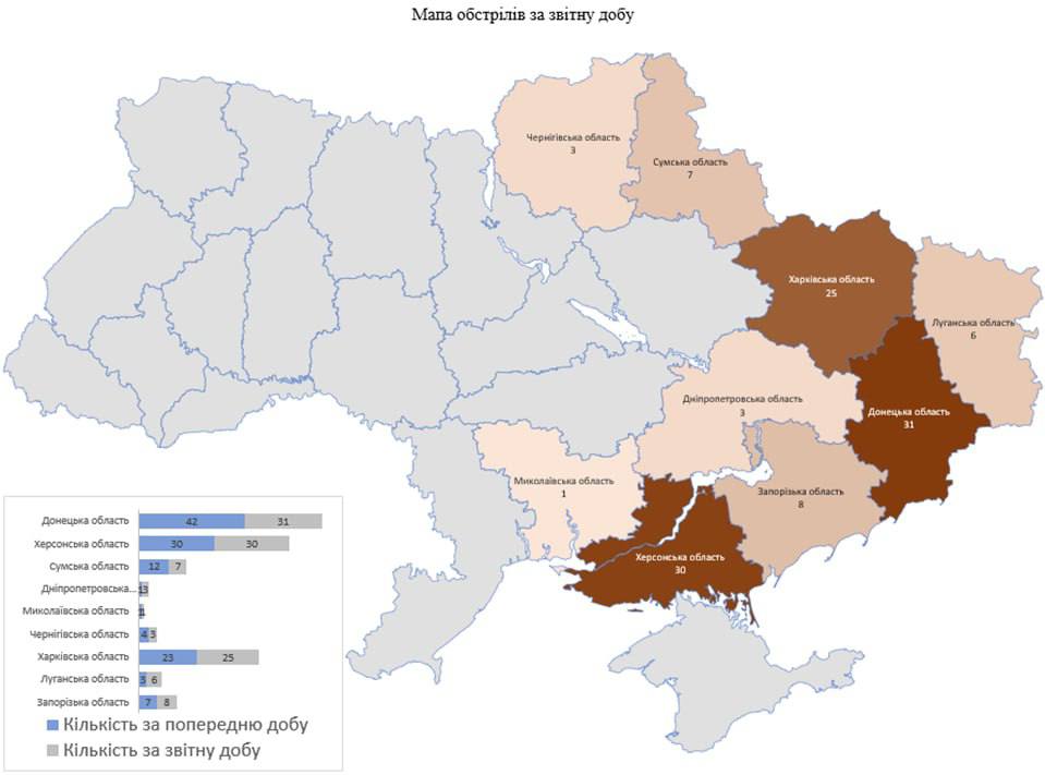 «Загалом із різних видів озброєння (міномети, танки, артилерія, РСЗВ, ЗРК «С-300», БПЛА, тактична авіація) здійснено обстріли 114 населених пунктів, підтверджено ураження 32 об’єктів інфраструктури», — йдеться в повідомленні.