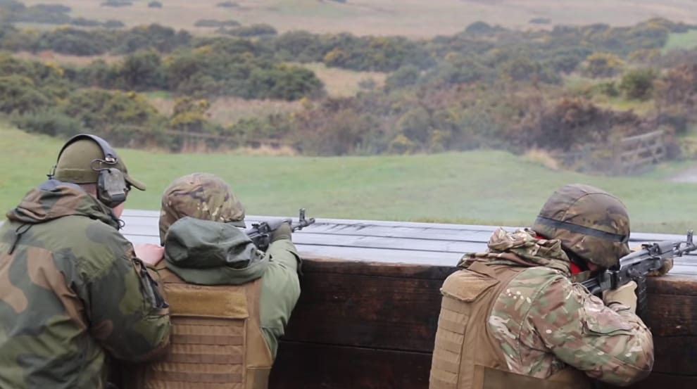 Інструктори Норвезької національної гвардії (Heimevernet) у складі норвезької місії з навчання українських військових у Великій Британії за програмою базової загальновійськової підготовки проводять заняття з ведення вогню відділенням зі стрілецької зброї в оборонному бою.