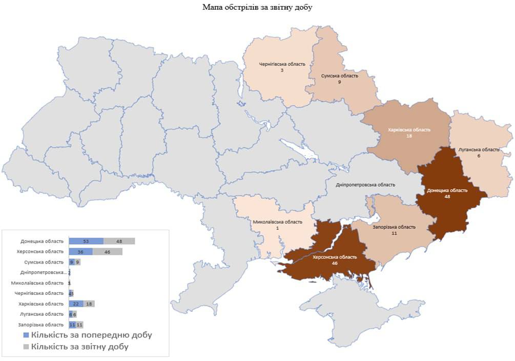 «Загалом із різних видів озброєння (міномети, танки, ствольна та реактивна артилерія, БПЛА, ЗРК «С-300», тактична авіація) здійснено обстріли 142 населених пунктів, підтверджено ураження 83 об’єктів інфраструктури», — йдеться у повідомленні.