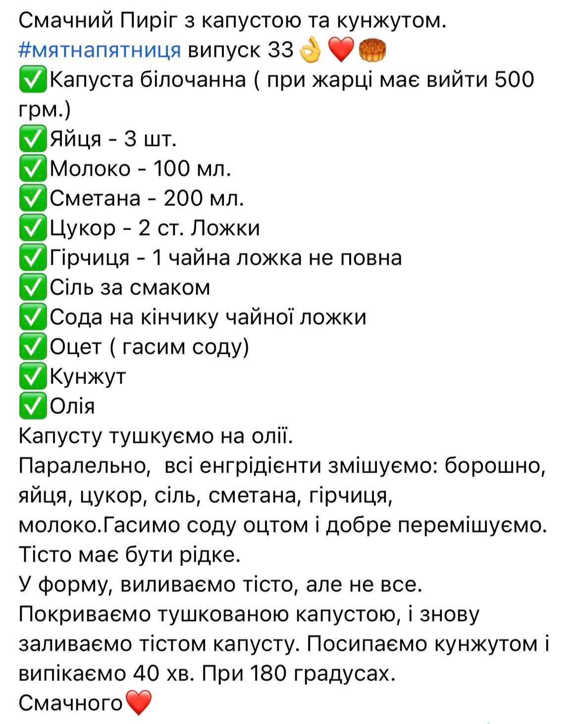 — Як я пам’ятаю з дитинства, бабуся завжди пекла паски, робила домашню ковбасу в тих баняках, буженину запечену в печі. На столі був хрін, писанки… Ці традиції ми зберігаємо й досі. А додатково на Великдень я буду готувати пиріг з капустою та кунжутом. Ось його рецепт…