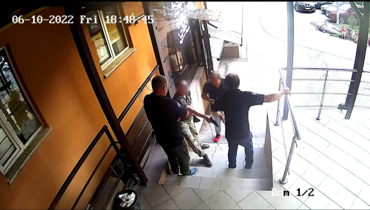 Після того як на місце події прибув наряд поліції, військовослужбовець намагався ввести в оману правоохоронців, вигадуючи різні версії того, що трапилося. А мешканцям, що зібрались навколо (зокрема й батькам наляканих дітей), погрожував роздати повістки в армію. Зрештою, через неадекватну поведінку працівники Нацполіції були змушені надягти на військовослужбовця кайданки.
