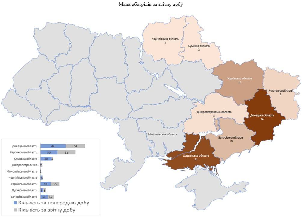«Загалом із різних видів озброєння (міномети, танки, артилерія, РСЗВ, ЗРК “С-300”, БПЛА, тактична авіація) здійснено обстріли 102 населених пунктів, підтверджено ураження 62 об’єктів інфраструктури», — йдеться у повідомленні.