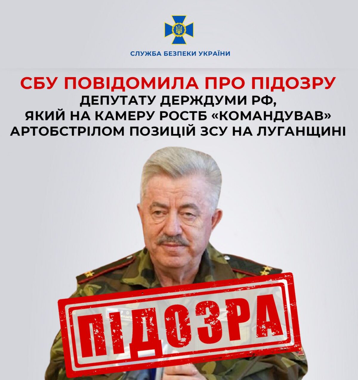 Служба безпеки зібрала доказову базу на депутата держдуми рф Віктора Водолацького. Посадовець виконує завдання москви щодо поширення окупаційного режиму на тимчасово захопленій території Луганщини.