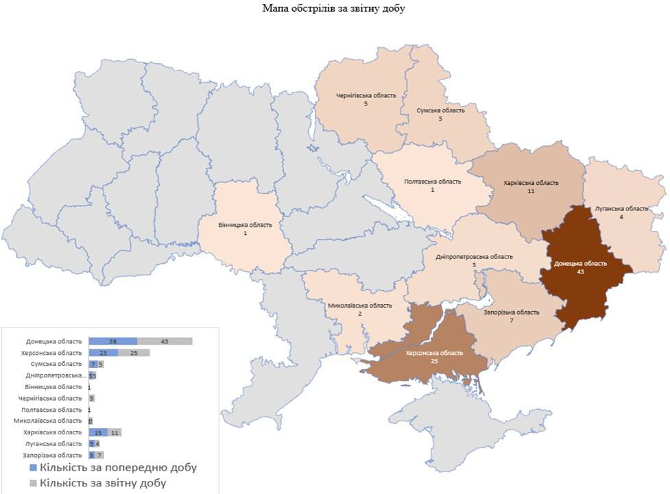 «Загалом із різних видів озброєння (стрілецька зброя, гранатомети, міномети, танки, артилерія, РСЗВ, ЗРК “С-300”, ударні БПЛА, тактична авіація) здійснено обстріли 107 населених пунктів, підтверджено ураження 34 об’єктів інфраструктури», — йдеться в повідомленні.