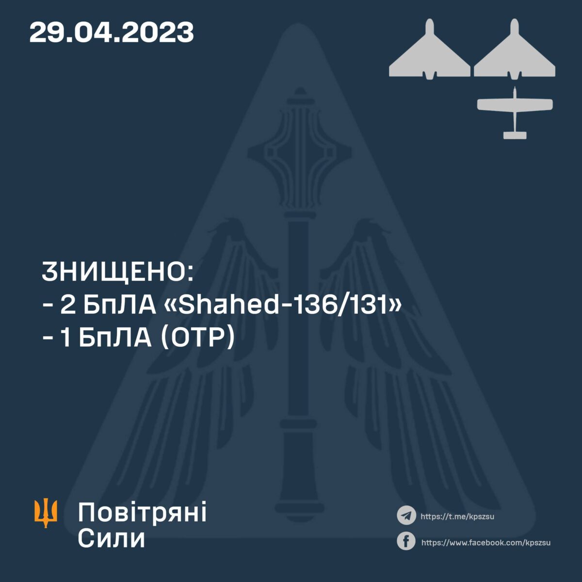 Збройні Сили України зранку 29 квітня знищили три російські безпілотні апарати: два типу Shahed та один БПЛА оперативно-тактичного рівня.