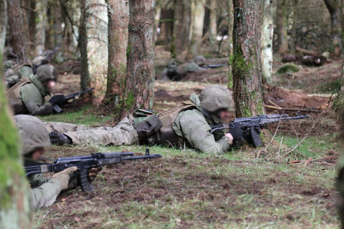 Інструктори Норвезької національної гвардії у складі норвезької місії з навчання українських військових у Великій Британії за програмою базової загальновійськової підготовки проводять заняття з ведення бойових дій в лісистій місцевості.