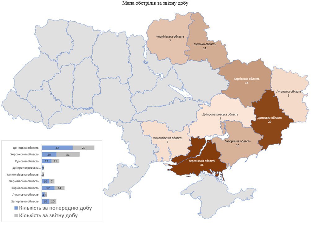 Загалом із різних видів озброєння (міномети, танки, артилерія, ОТРК, ЗРК, БПЛА, тактична авіація) здійснено обстріли 108 населених пунктів, підтверджено ураження 85 об’єктів інфраструктури.