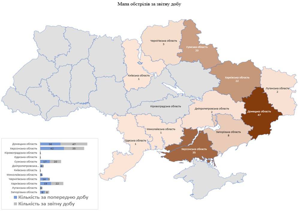 Загалом із різних видів озброєння (стрілецька зброя, міномети, танки, артилерія, РСЗВ, ЗРК, БПЛА, тактична авіація) здійснено обстріли 142 населених пунктів, підтверджено ураження 173 об’єктів інфраструктури.
