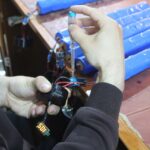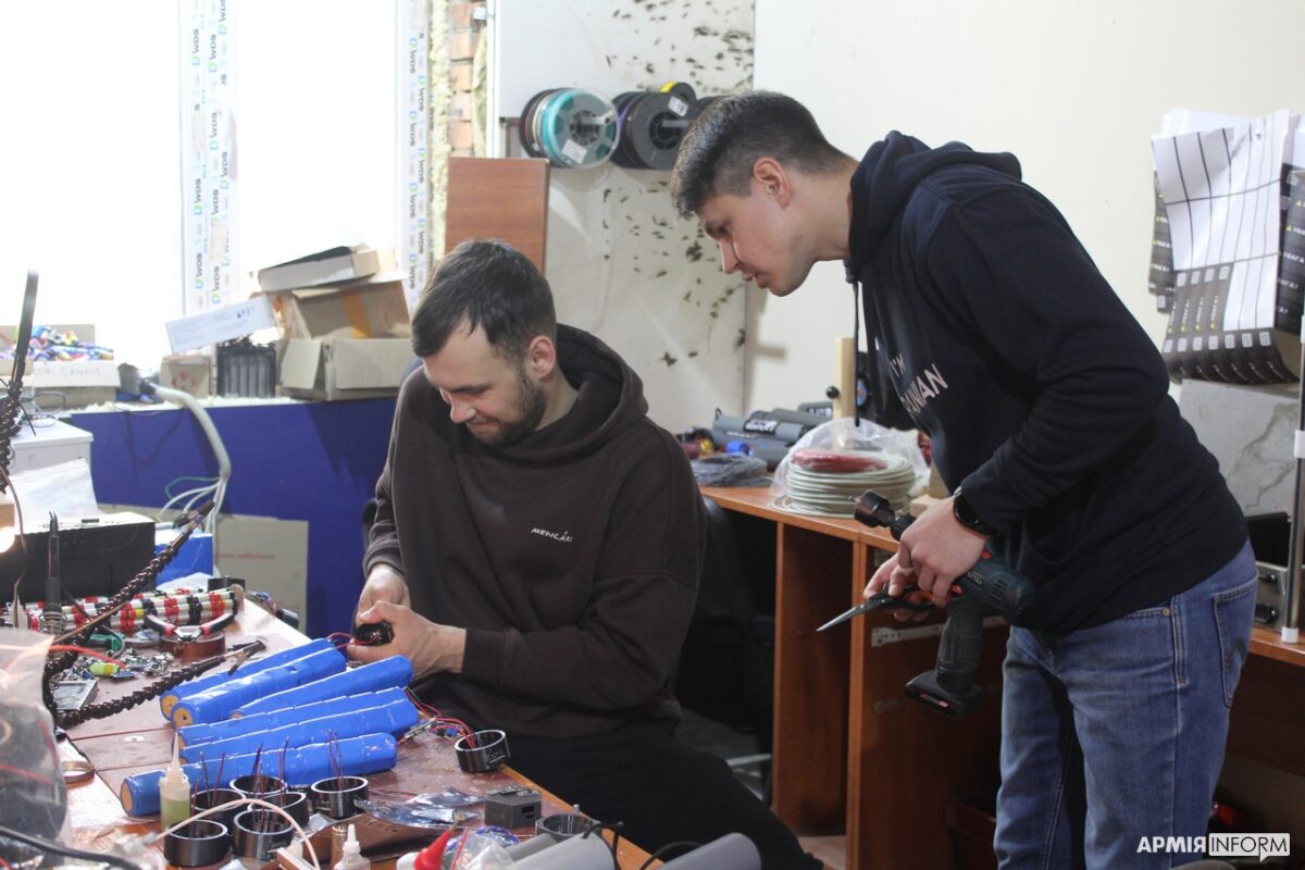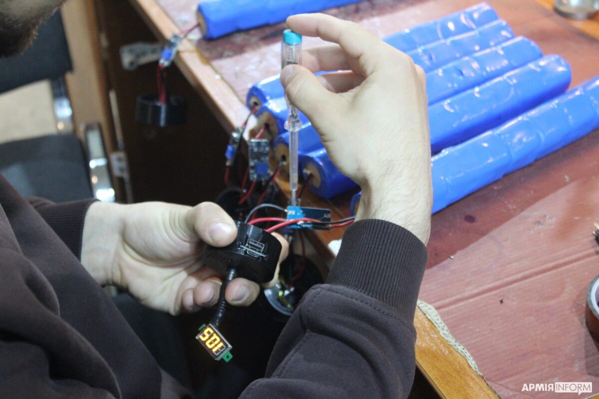 Екскурсію по цеху для АрміяInform провів один із волонтерів Станіслав. Сам він за освітою радіотехнік. Чоловік розповів про кожен етап виробництва — тут він почуває себе як риба у воді. З початком широкомасштабного вторгнення рф хотів робити щось важливе для армії. Коли випадково наткнувся на сторінку PowerKit в Інстаграм, відразу запропонував свою допомогу. Розповідає, що навіть зміг модернізувати павери — зробити їх дешевшим у виробництві. Перша точка — перевірка акумуляторів для майбутнього павера на справність. Спеціальний прилад показує вольтаж батарейки, якщо на вимірювачі більш як 1 — це майбутня деталь павера.