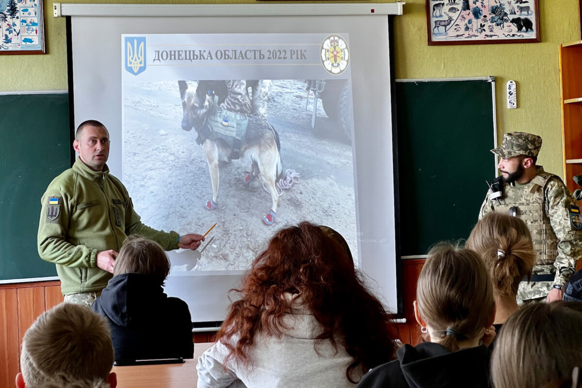 Військовослужбовці Об’єднаного навчально-тренувального центру Сил підтримки за запрошенням воїна територіальної оборони Олега Анатолійовича завітали до учнів однієї зі шкіл Хмельницького, де навчається його син. Дітям розповіли про роль службових собак у Збройних Силах України, про їхню участь у миротворчих місіях та розмінуванні деокупованих територій України. Учні з цікавістю слухали кінологів, особливо про роботу службових собак під час російсько-української війни.