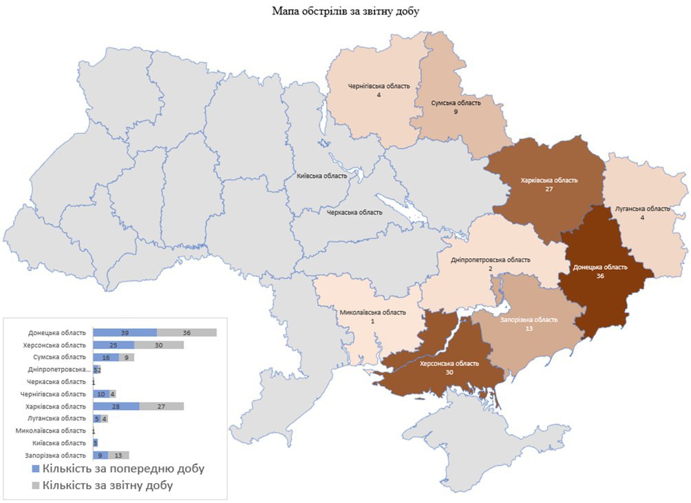 «Обстріли велись із різних видів озброєння (міномети, танки, артилерія, РСЗВ, ЗРК, БПЛА, тактична авіація). Здійснено обстріли 126 населених пунктів, підтверджено ураження 153 об’єктів інфраструктури», — йдеться в повідомленні.