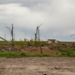 Час від часу чутно вибухи — працюють сапери… А обабіч дороги на торішніх засохлих соняшниках вітер смикає залишки стрічки, яка свідчить про те, що сходити з ґрунтової дороги небезпечно для життя…