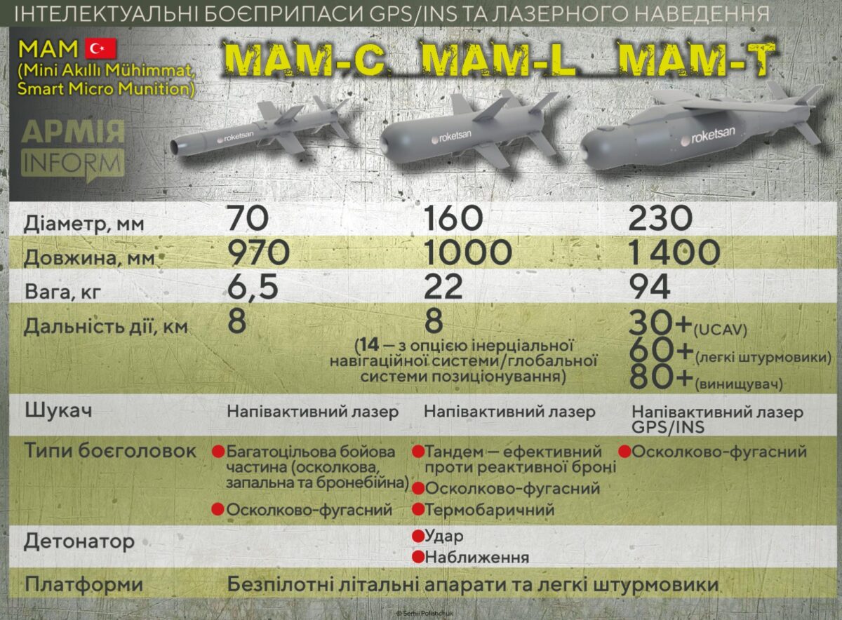 Довідково. Загалом MAM (Mini Akıllı Mühimmat — «розумні мікробоєприпаси») — це таке собі турецьке сімейство високоточних малогабаритних боєприпасів із лазерною головкою самонаведення. Вони призначені для літальних апаратів, коли маса корисного навантаження відіграє вирішальну роль. Бомби MAM-C мають вагу 6,5 кг та дальність пуску 8 км. MAM-L можуть уражати ціль на відстані до 15 кг і важить 22 кг. Найбільша бомба — MAM-T. Вона має дальність 30/60/80 км і важить 94 кг. Тож розглянемо ці та деякі інші вироби з родини МАМ дещо детальніше.