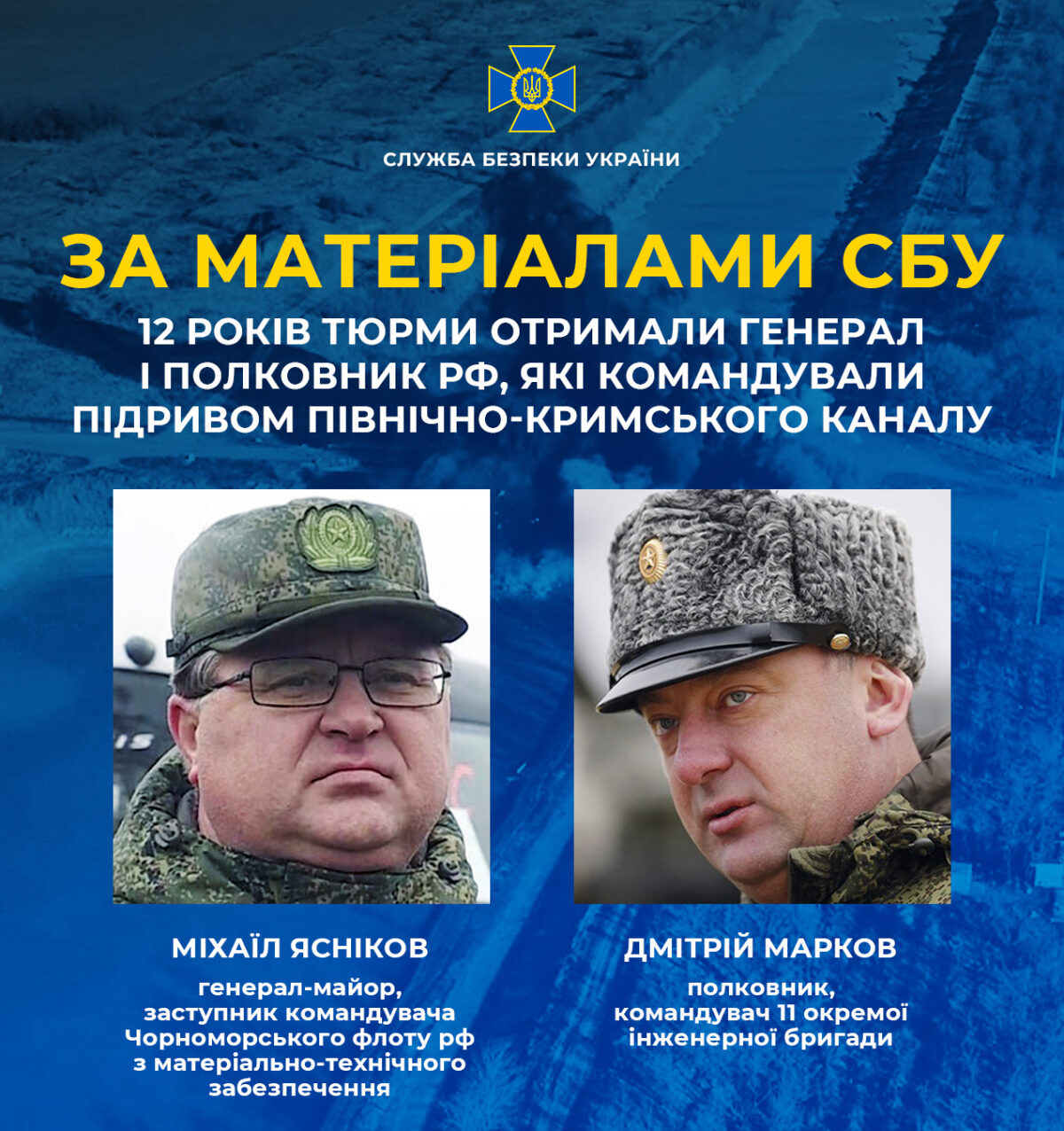 «Мова йде про заступника командувача Чорноморського флоту рф з матеріально-технічного забезпечення генерал-майора Міхаїла Яснікова і командувача 11-ї окремої інженерної бригади полковника Дмітрія Маркова. Обидва посадовці безпосередньо командували захопленням Каховської ГЕС та підривом споруд Північно-Кримського каналу», — зазначають у СБУ.