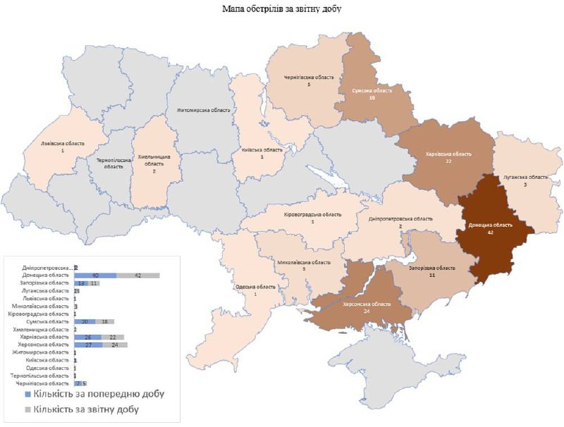 Із різних видів озброєння (міномети, танки, артилерія, РСЗВ, ударні БПЛА, стратегічна та тактична авіація) були обстріляні 136 населених пунктів та 48 об’єктів інфраструктури.