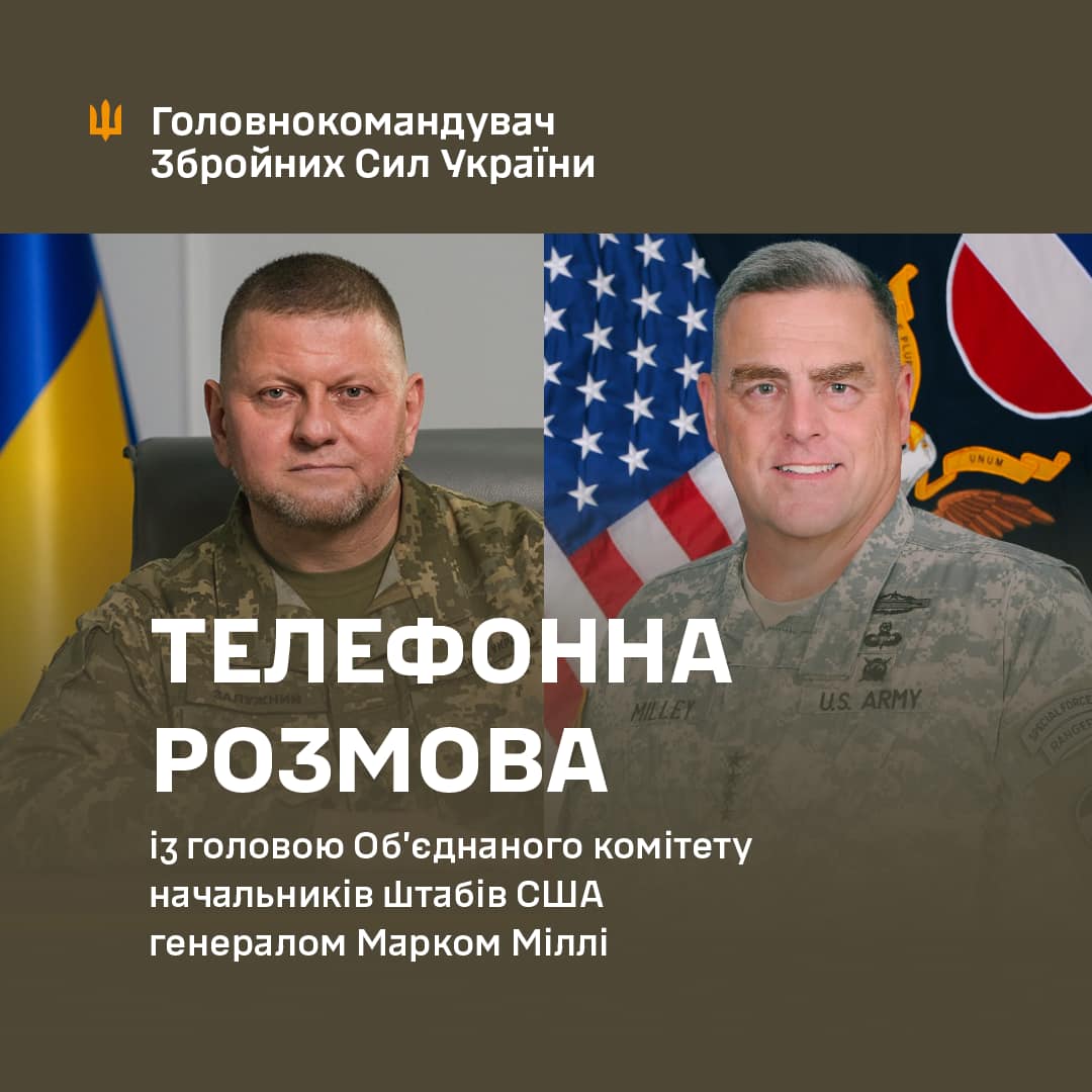 Головнокомандувач ЗСУ генерал Валерій Залужний провів телефонну розмову з головою Об’єднаного комітету начальників штабів США генералом Марком Міллі. Про це йдеться на фейсбук-сторінці Головнокомандувача ЗСУ.
