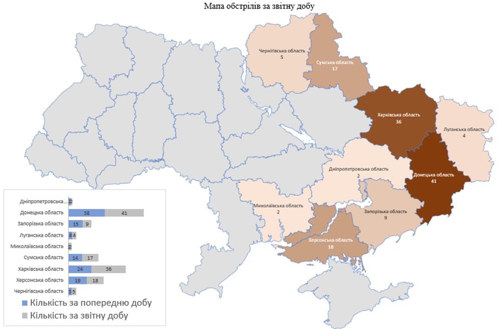 Із різних видів озброєння (міномети, танки, артилерія, РСЗВ, ЗРК, БПЛА, тактична авіація) були обстріляні 134 населених пункти та 90 цивільних об’єктів інфраструктури.