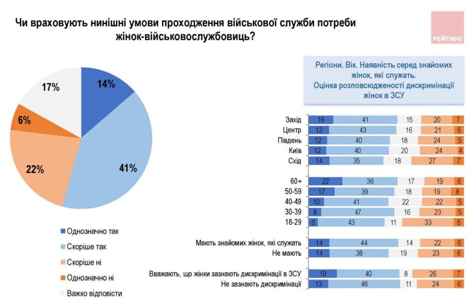 З даними дослідження, 48% опитаних вважають рідкісними нерівності між жінками та чоловіками в ЗСУ, і 51% вважає, що жінки в українській армії не зазнають дискримінації.