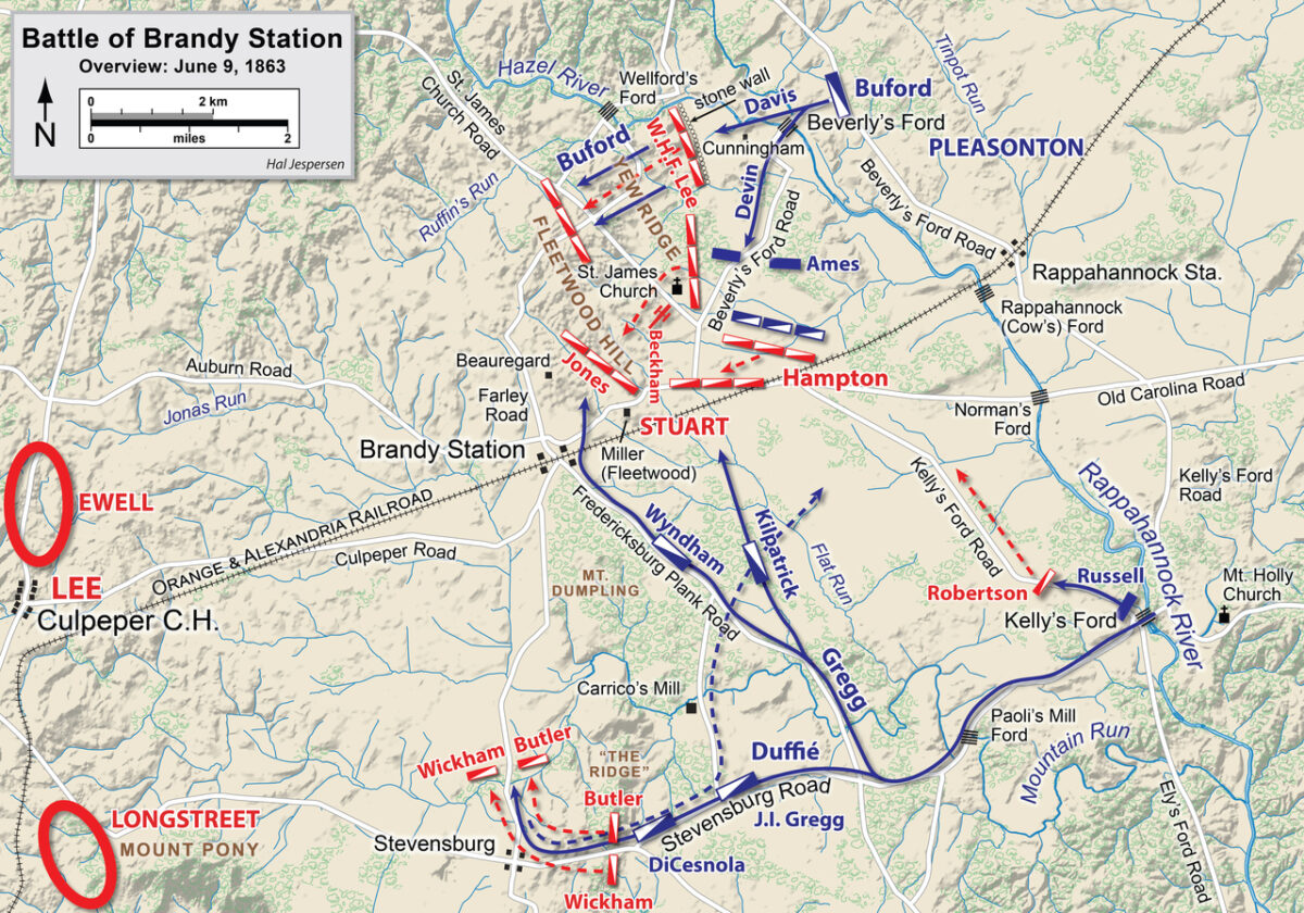 Ініціатива початку битви належала федератам, які планували завдати ворогу поразки за рахунок фактору раптовості. Цікаво, що генерал Альфред Плезантон не володів реальною інформацією про кількість ворожих сил, вважаючи, що під командуванням Стюарта перебуває щонайменше 15, а можливо і 20 тис. вояків. Це робить план превентивної атаки кінноти північних штатів ще зухвалішим — раптовим наскоком федерати розраховували розбити ворожі сили, у 1,5–2 рази більші за їхні власні.