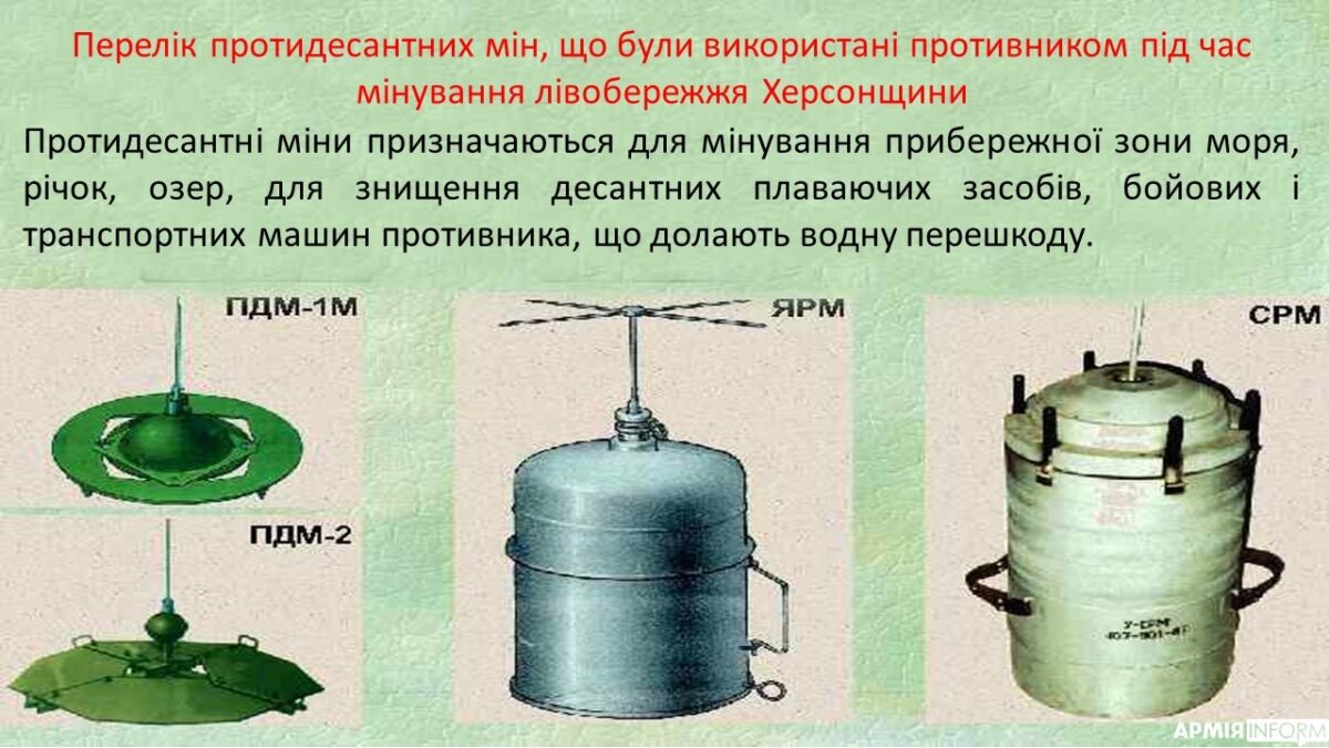 Так, партизани повідомляють що напередодні підриву греблі Каховського ГЕС підрозділи противника активно мінували лівий берег Дніпра впродовж останніх декількох місяців і зокрема із використанням якірних річкових мін (далі – ЯРМ) та інших, які під тиском води почало змивати та зносити в напрямку руху течії.