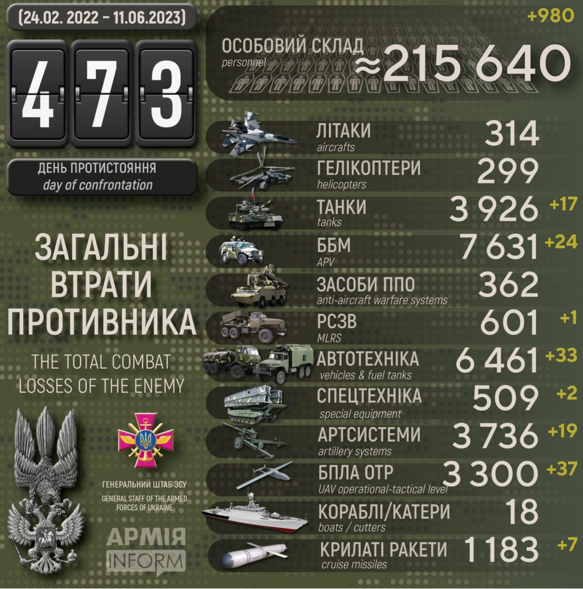 Загальні бойові втрати противника з 24.02.22 по 11.06.23 орієнтовно становлять: