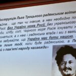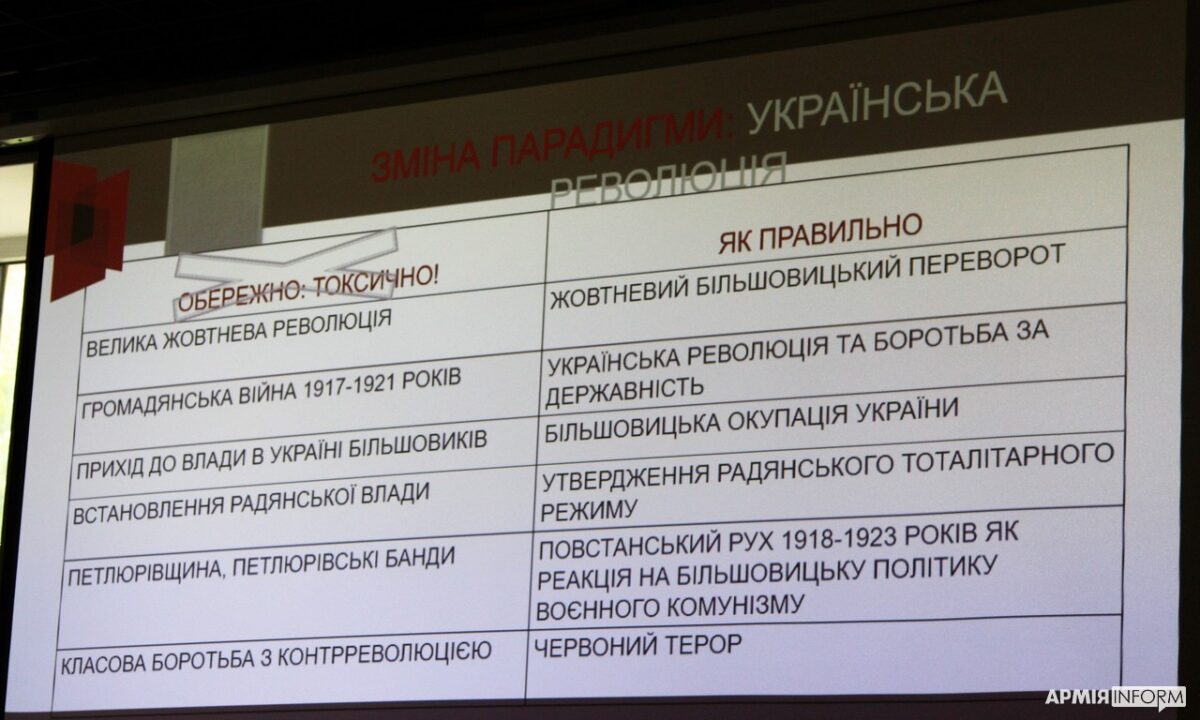 — Так на фоні лютневої революції в російській імперії в Києві була створена Українська Центральна рада, головою якої був обраний Михайло Грушевський, а також утворено уряд. У листопаді того ж року в Києві проголосили УНР, розпочалось творення українського війська, українізація російської імператорської армії, запровадження військової термінології козацької доби, вводилися українські військові ранги. Проте більшовики, які прийшли до влади після перевороту, дуже швидко почали війну порти України. Тут ми можемо навести таку паралель: ленін висунув українцям цинічний ультиматум, у якому звинуватив їх у «нечуваній зраді революції». І вже у 2014 році путін звинувачує українців у зраді «русского мира», закидаючи їм, що вони «хунта, фашисти, каратєлі» тощо.