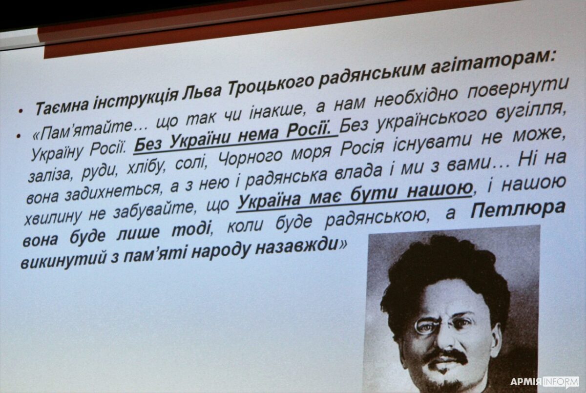 Ці слова — уривок із таємної вказівки одного з організаторів жовтневого перевороту 1917 року Льва Троцького. Відправляючи радянських агітаторів до України, він казав: «Пам’ятайте… що так чи інакше, а нам необхідно повернути Україну росії. Без України нема росії. Без українського вугілля, заліза, руди, хлібу, солі, Чорного моря росія існувати не може, вона задихнеться, а з нею і радянська влада і ми з вами… Ні на хвилину не забувайте, що Україна має бути нашою, а нашою вона буде лише тоді, коли буде радянською, а Петлюра викинутий з пам’яті народу назавжди».