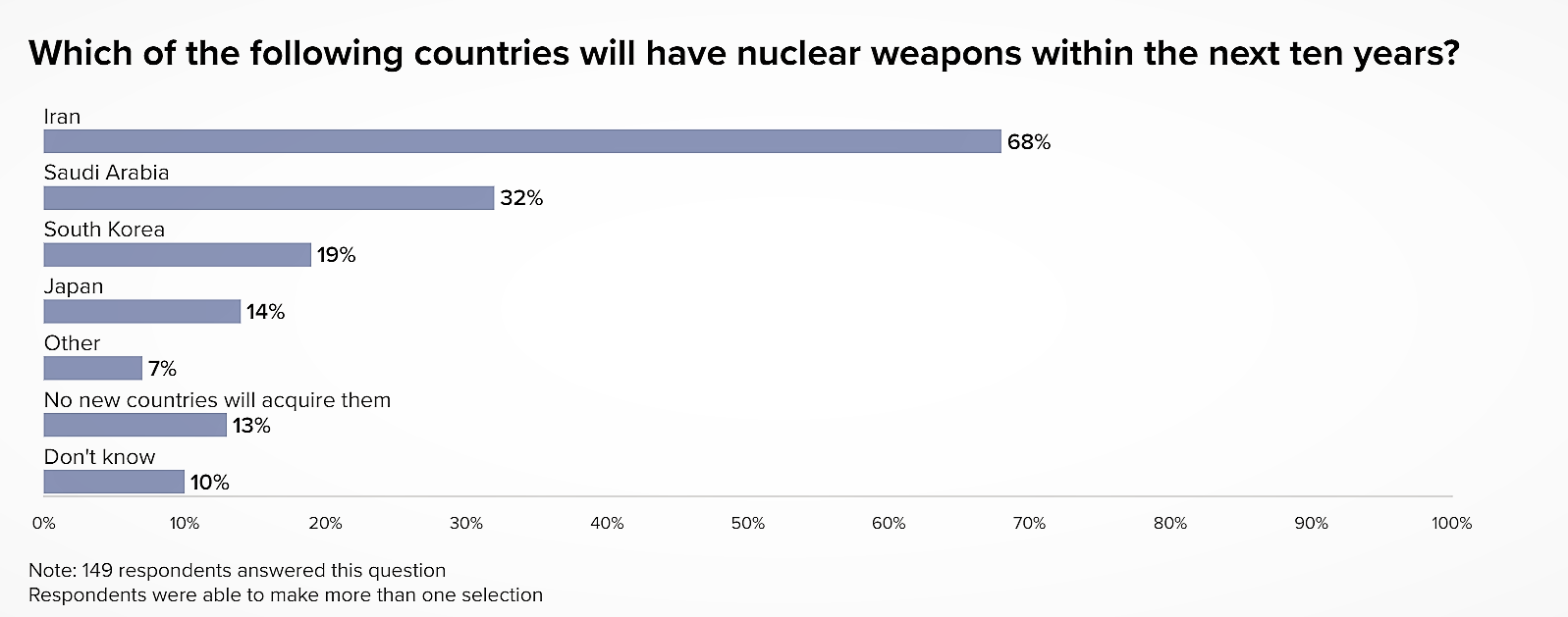 Експерти очікують, що регіональне суперництво приведе до розповсюдження ядерної зброї протягом наступного десятиліття. Певний відсоток із них передбачає, що вона з’явиться в Ірану (68 %), Саудівської Аравії (32 %), Південної Кореї (19 %), Японії (14 %).