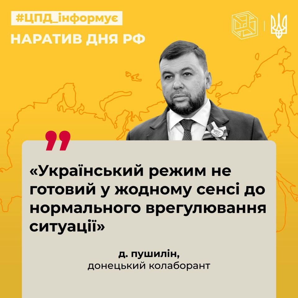 Центр протидії дезінформації при РНБО України інформує: основний наратив, що просувають російські ЗМІ, зокрема, заявляє донецький колаборант пушилін, що «український режим не готовий до нормального врегулювання ситуації».