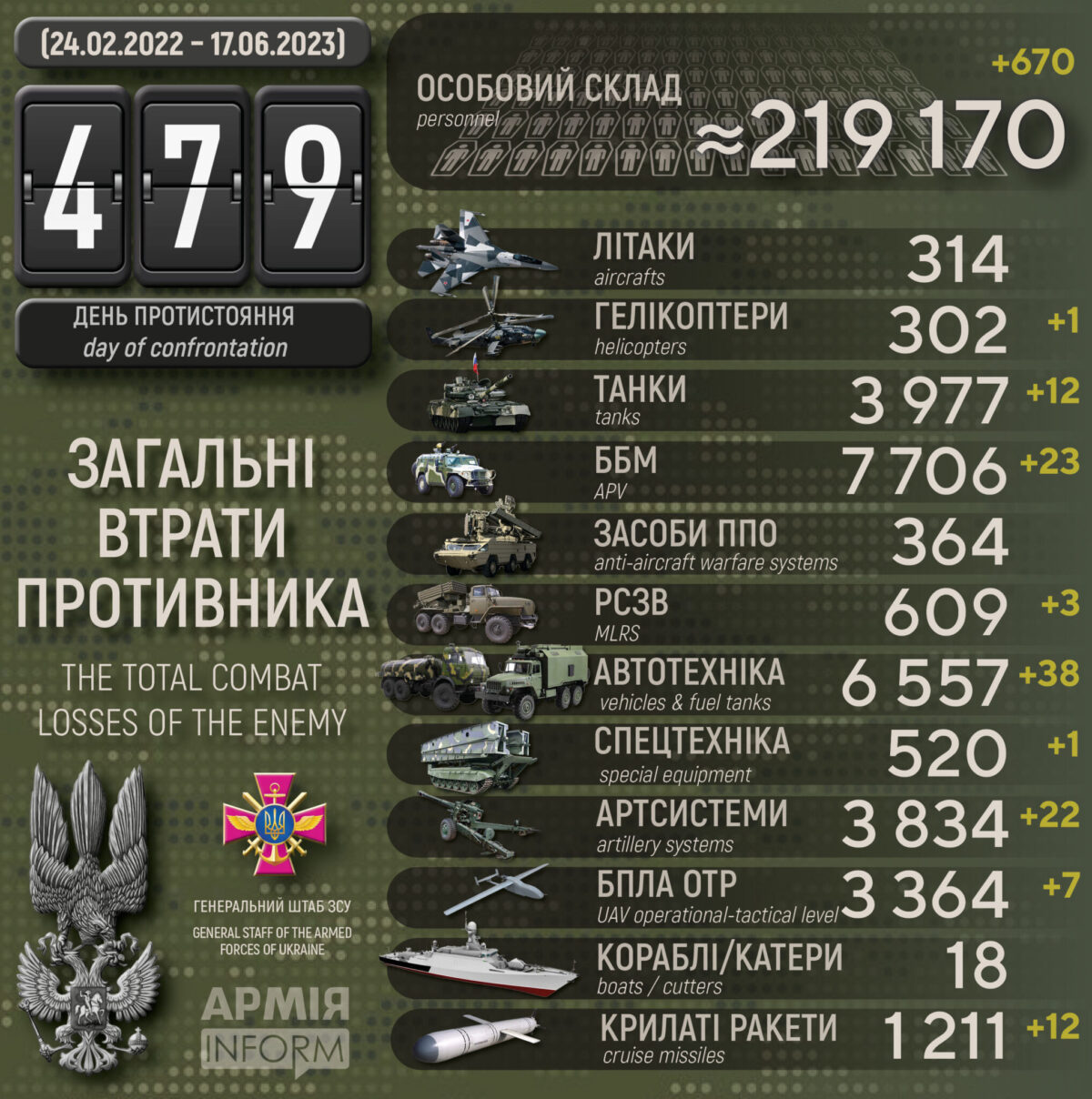 Джерело: Генеральний штаб Збройних Сил України станом на 17.06.23.