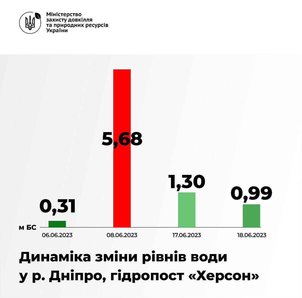 У цілому з 8 червня рівень води з 5,68 метра знизився на понад 4,69 м і наразі становить 0,99 м за балтійською системою. Для порівняння, до підриву греблі Каховської ГЕС рівень води в Дніпрі на позначці «Херсон» становив 0,31 метра.