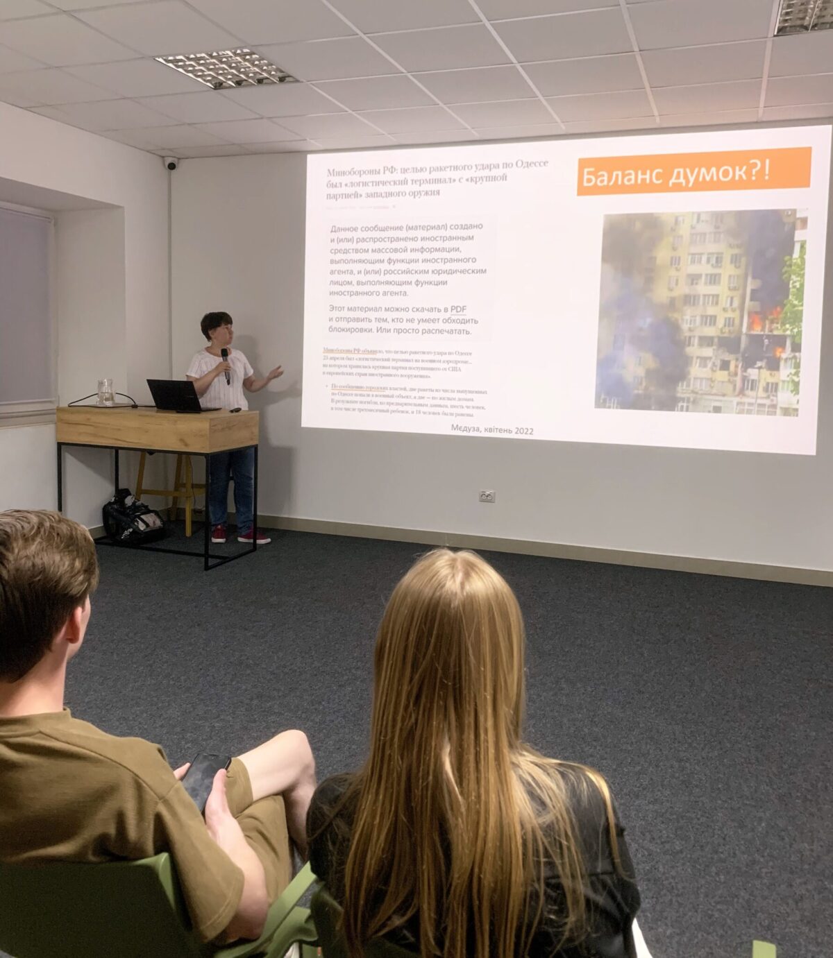 — Одеса, квітень 2022 року, влучання по багатоповерхівці, де загинули люди, зокрема і моя колишня студентка. Все місто знало, звідки летіло і куди влучило. «Ліберальне» росЗМІ «Медуза» пише, що «це не будинок, а логістичний термінал». Уявімо, що ми живемо десь у російському Владивостоці або в іншій крані і ніколи не були в Одесі. Читаємо таку новину і починаємо думати, що всі в чомусь брешуть, — розказала професорка.