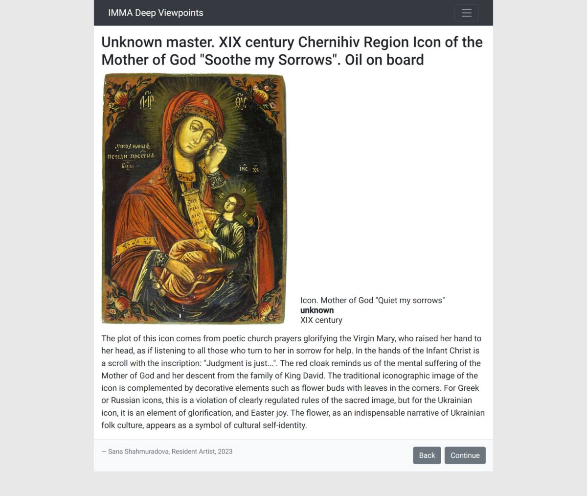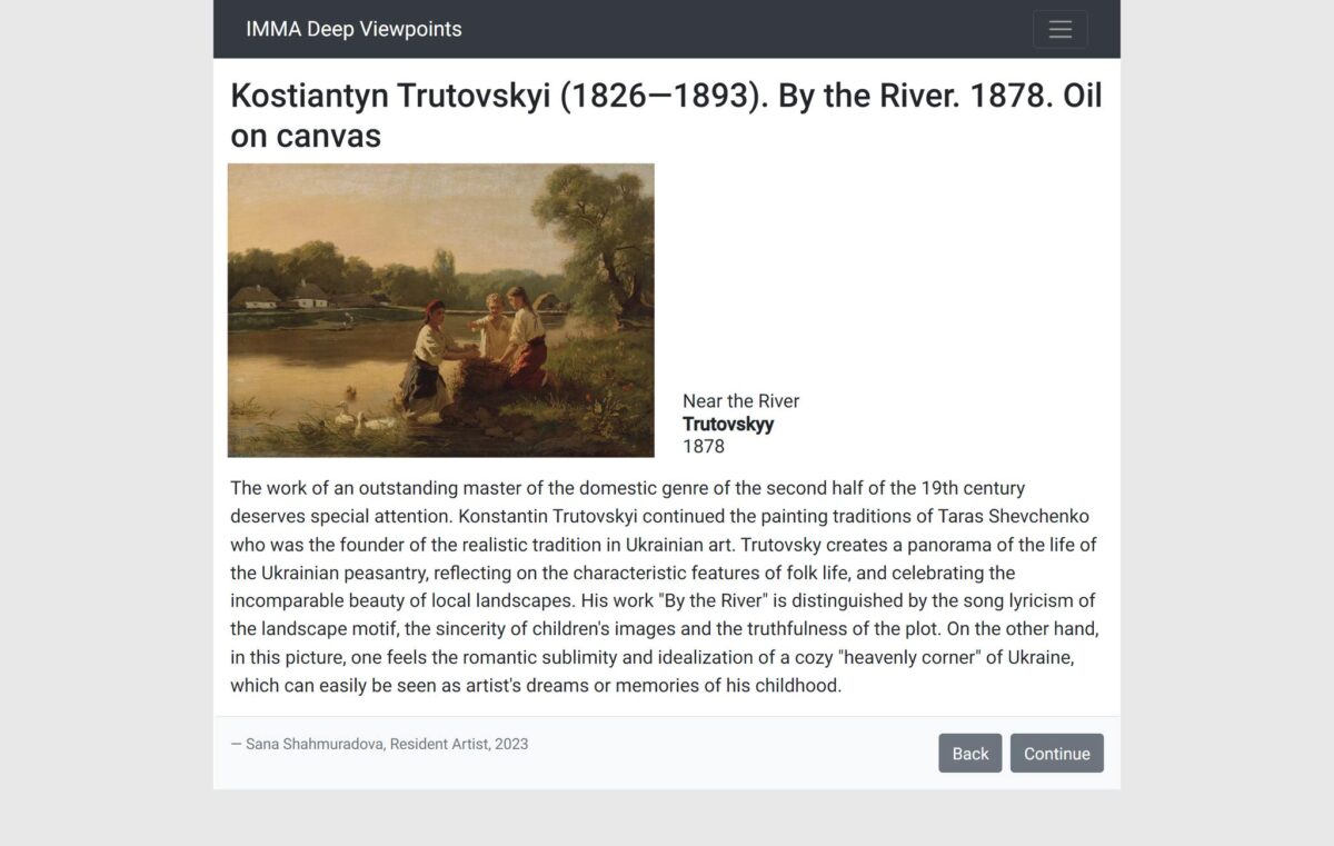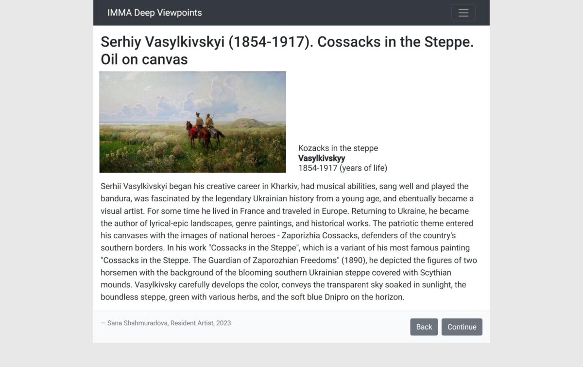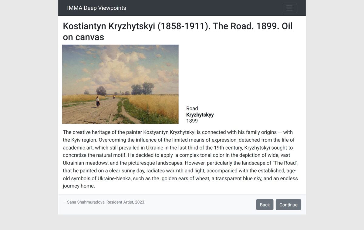Перебуваючи у квітні цього року на художній резиденції в Дубліні, мисткиня запропонувала IMMA познайомити відвідувачів їхнього ресурсу з викраденими росіянами творами українських музеїв. Зосередитися вона вирішила саме на колекції Херсонського художнього.