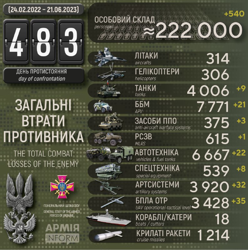 Загальні бойові втрати противника з 24.02.22 по 21.06.23 орієнтовно становлять: