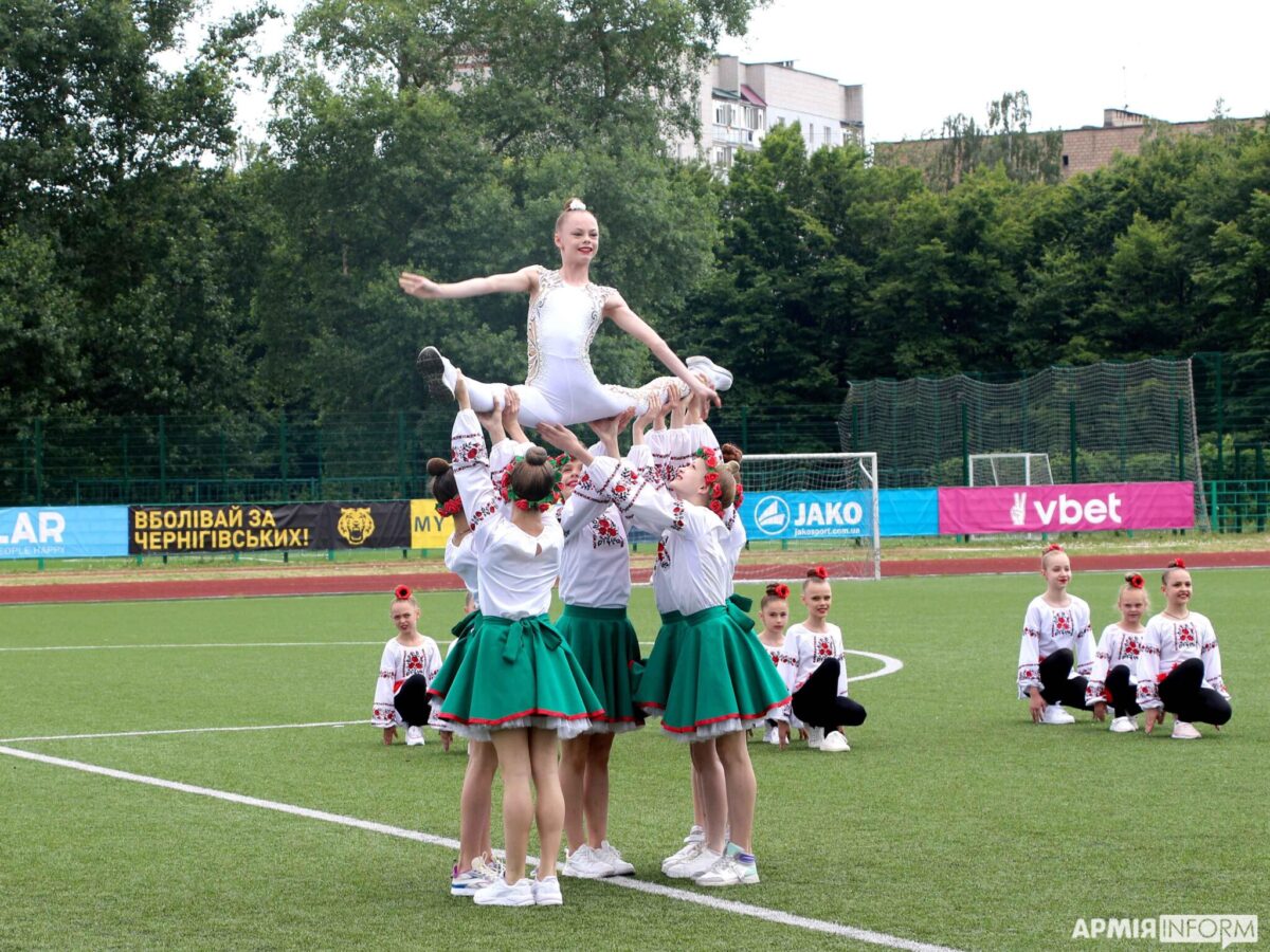 А патріотичною хореографічною композицією «Перлина Україна» спортсменів привітали юні гімнастки ДЮСШ «Чернігів» та Чернігівської обласної школи вищої майстерності.
