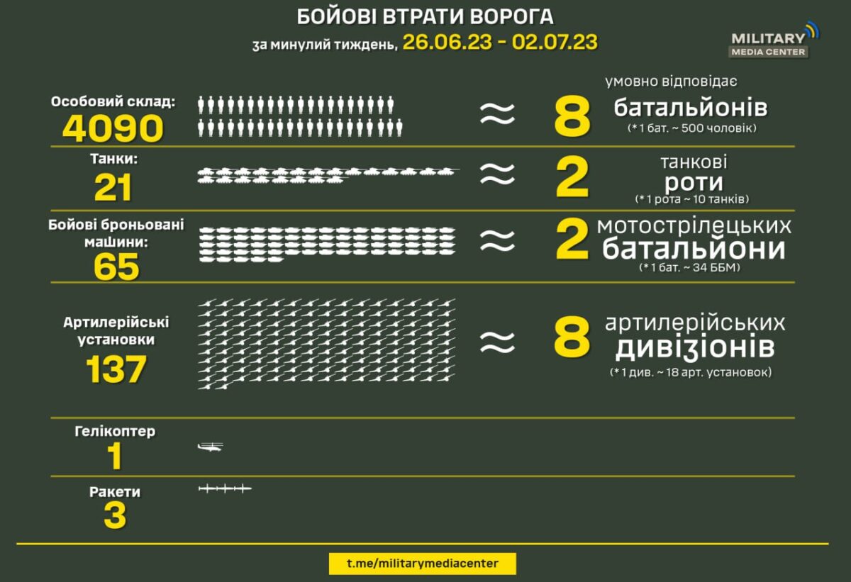 За минулий тиждень, з 26 червня по 2 липня, Сили оборони України знищили майже 8 батальйонів, 21 танк,65 ББМ та іншу техніку й озброєння противника.