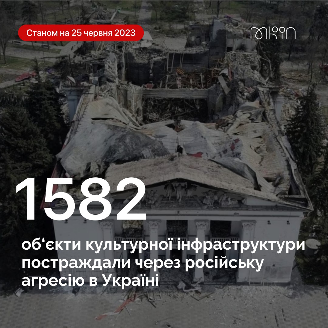 «Міністерство культури та інформаційної політики України продовжує фіксувати пошкодження об’єктів культурної інфраструктури в Україні внаслідок російської агресії. Так, станом на 26 червня 2023 року збитків зазнали 1582 об’єкти культурної інфраструктури, без урахування пам’яток культурної спадщини. З них майже третина (585) — зруйновані.