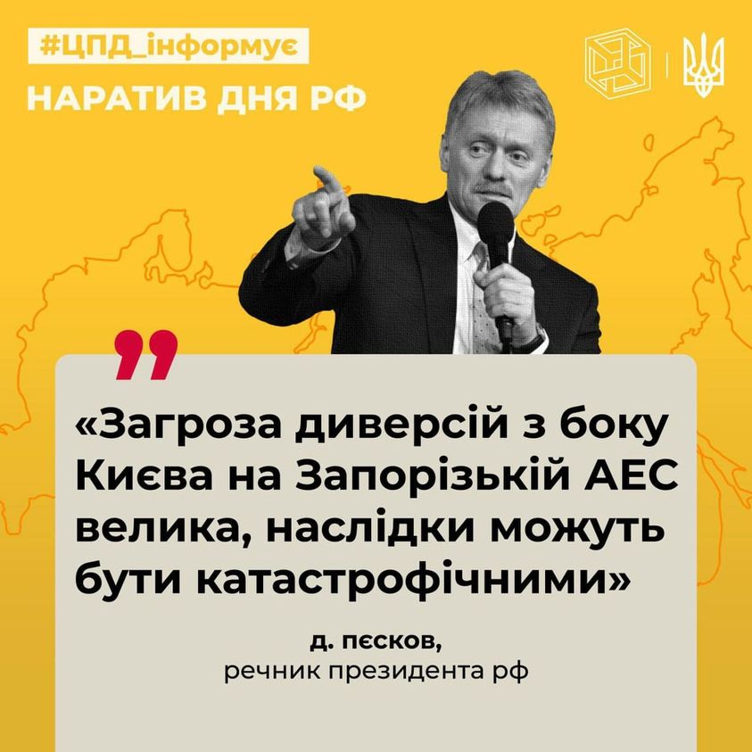 Так речник путіна пєсков заявляє, що «загроза диверсій збоку Києва на ЗАЕС велика, наслідки можуть бути катастрофічними».