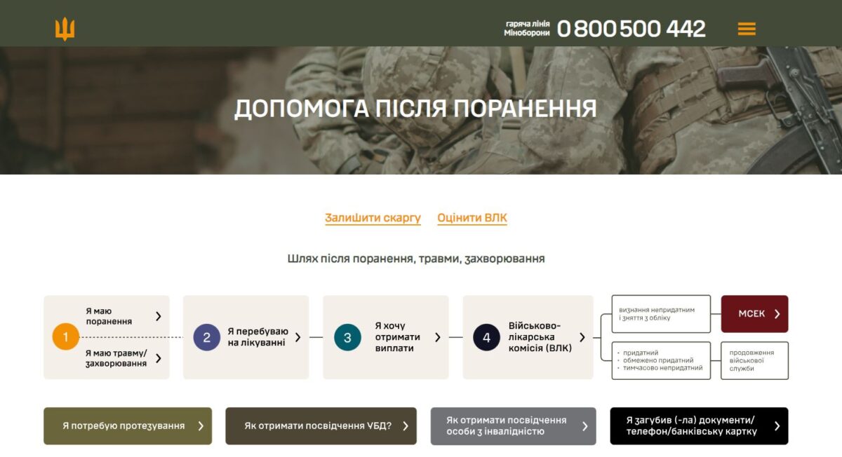 — Зворотний зв’язок із сайту «Турбота», з гарячої лінії регулярно збирається і аналізується Командуванням Медичних Сил та командою проєкту модернізації ВЛК, — додала Оксана Ферчук. — У всіх діючих ВЛК розміщено інформаційні плакати і довідники, у яких є інформація щодо сайту, номеру гарячої лінії та QR-коди для зворотнього зв’язку. Міністерство оборони закликає військових та їхні родини до зворотного зв’язку, адже це допоможе належно оцінити роботу військово-лікарських комісій і відкоригувати помилки.