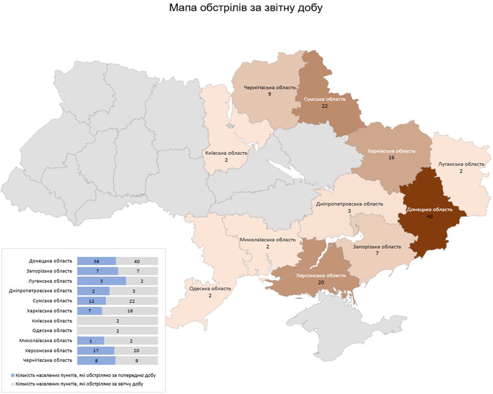 Із різних видів озброєння — стрілецька зброя, гранатомети, міномети, ствольна та реактивна артилерія, танки, БПЛА, тактична авіація — були атаковані 125 населених пунктів та 73 об’єкти інфраструктури.