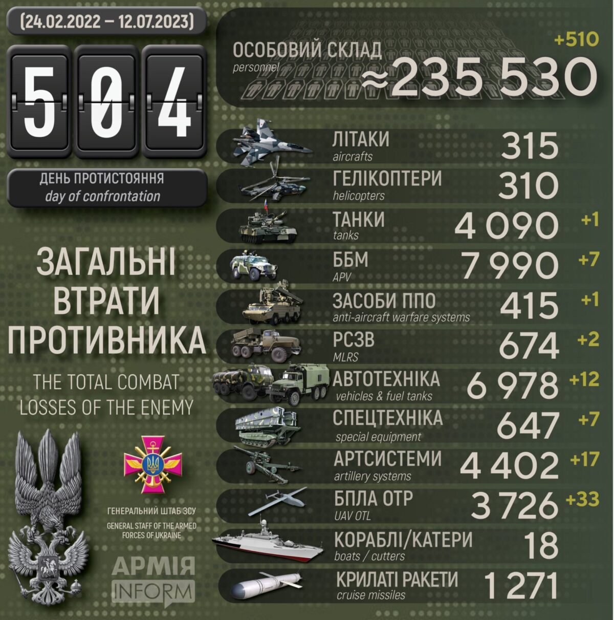 Загальні бойові втрати противника з 24.02.22 по 12.07.23 орієнтовно становлять: