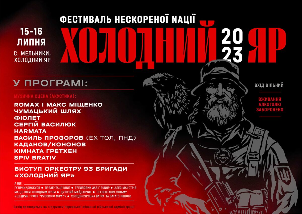 15–16 липня у селі Мельники Медведівської громади Черкаської області відбудеться Фестиваль нескореної Nації «Холодний Яр». Під час великої війни організатори збирають велике коло друзів, які на всіх фронтах захищають Україну від російських загарбників.