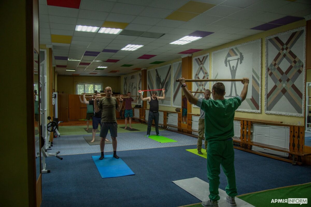 Над відновленням опорно-рухового апарату після компресійних ударів, які сталися на фронті, військовослужбовці працюють на заняттях з лікувальної фізкультури. У деяких випадках ортопед призначає курс мануальної терапії та масажів.