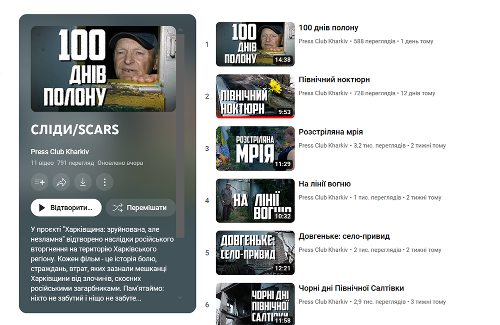 Цикл фільмів під загальною назвою «СЛІДИ/SCARS» — це розповіді про наслідки війни на Харківщині. У межах реалізації проєкту «Харківщина: зруйнована, але незламна» документалісти Громадської організації «Харківський прес-клуб» занотовують спогади про «сліди та шрами» воєнних злочинів, скоєних російськими окупантами на Слобожанщині. Керівник Харківського пресклубу Олександр Швець та координатор Геннадій Хомік розповіли про важливість проєкту для регіону кореспондентові АрміяInform.
